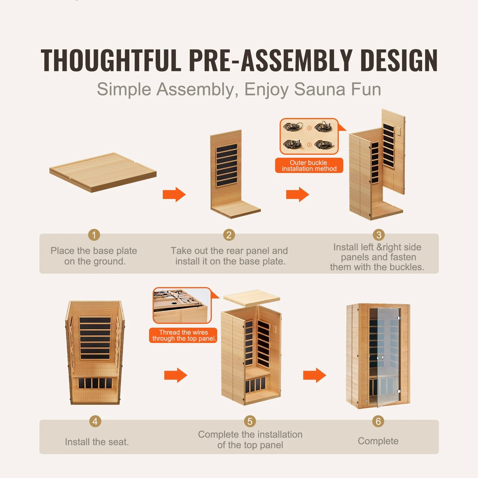 - Crafted from high-quality Canadian Hemlock wood, this sauna is durable, naturally insulating, and resistant to cracking or warping. Its smooth finish and natural wood scent create a calming spa-like atmosphere right in your home.